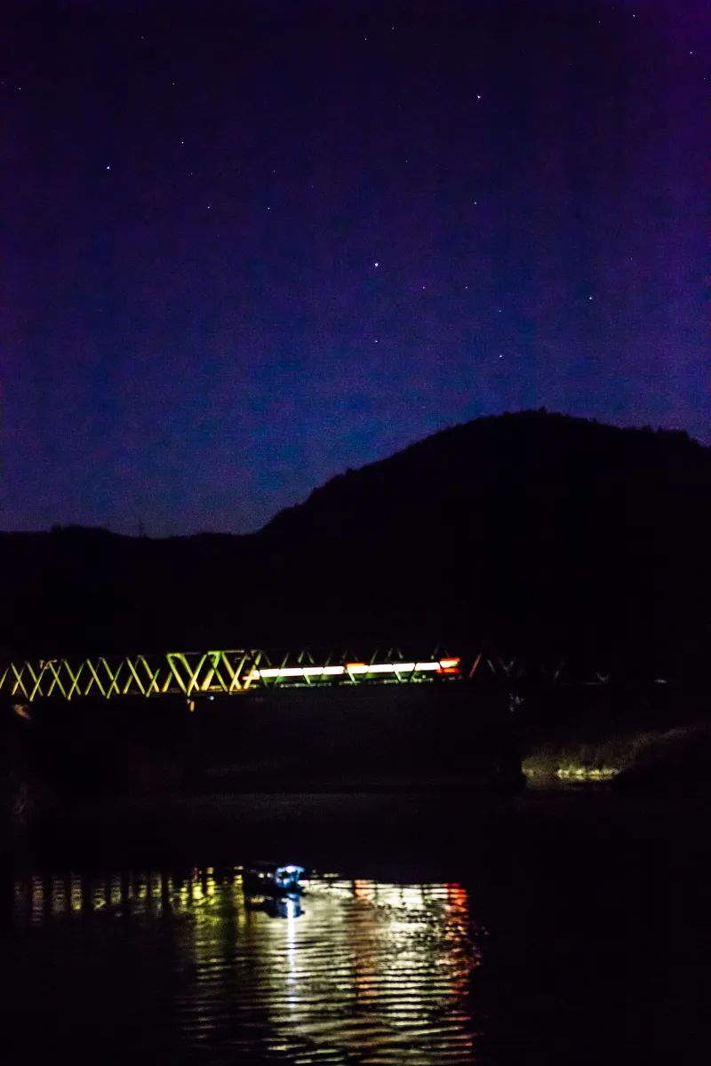 暗闇と静寂が織りなす漆黒の阿武隈川と星空、阿武隈急行の列車が鉄橋を通過する風景…昼の時とは異なる阿武隈川の様相をご覧ください。